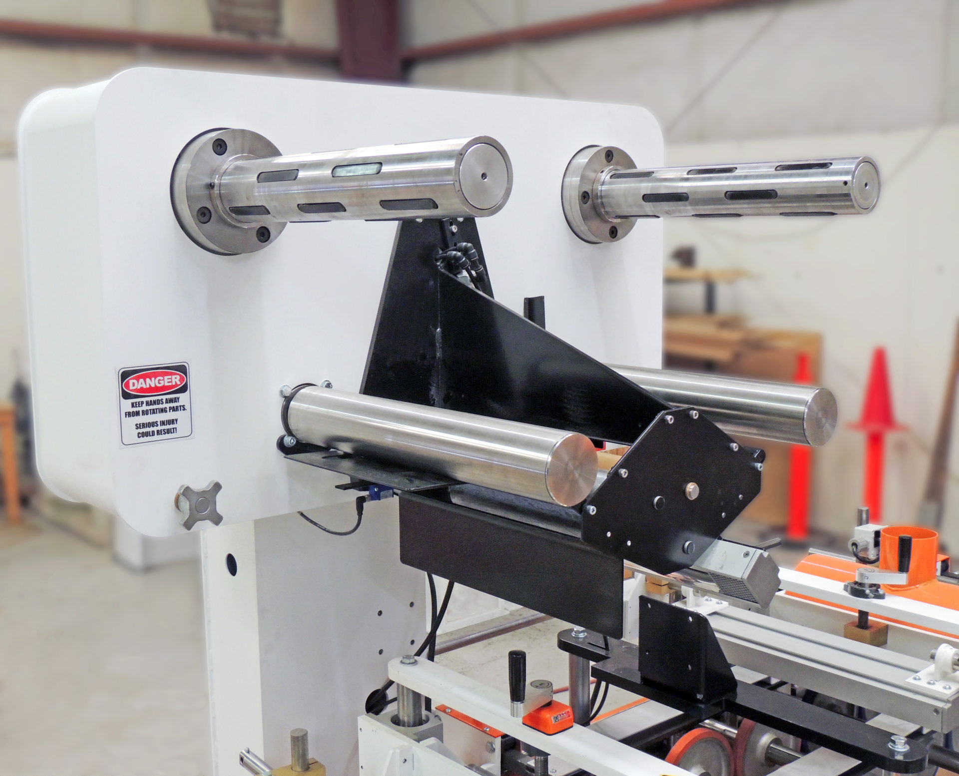 The HML-8 Profile Laminator applies hot melt adhesives to the back of the various paper, foil, or vinyl webbings, and wraps the webbings around all types of profiled wood, extruded plastics, and metal substrates. The base hot melt wrapper is furnished complete with; two unwind spool and film tensioners, a splicer assembly, a hot melt adhesive applicator, a film tracking system, an edge guide assembly, a substrate cleaner, a top infeed press roller assembly, a touch screen control panel, and a continuously driven six-segment removable cartridge section.
